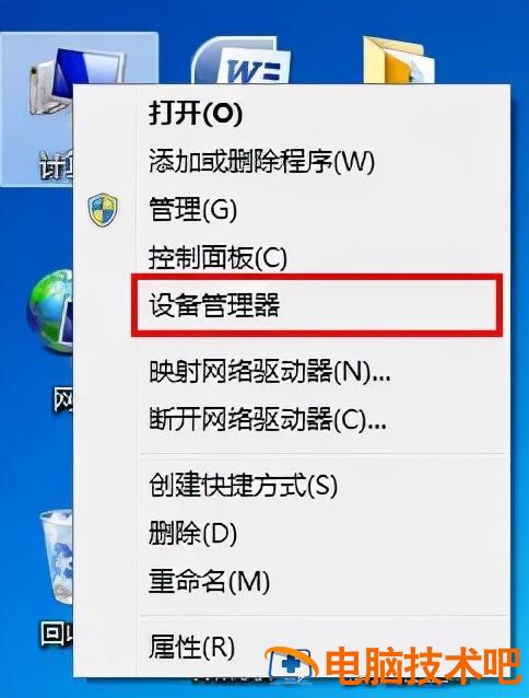 首先将鼠标移到桌面计算机图标上,单击右键,然后在弹出菜单中选择设备管理器,如下图所示:
