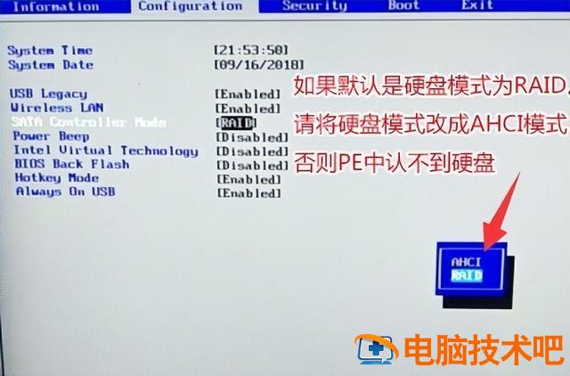 然后返回configuration,查看sata controller mode如果看到默认硬盘模式,选项RAID要改成AHCI更改后按下模式f10。