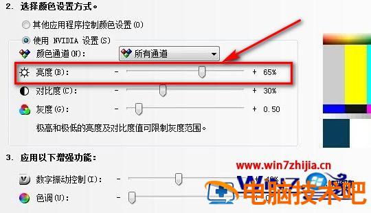四、在【NVIDIA控制面板】中,找到【亮度】模块,左右拖动滑块即可调整电脑屏幕亮度。