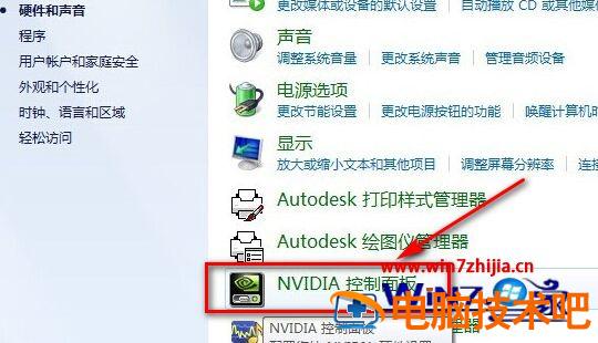 三、在【硬件和声音】的设置界面,找到最下方的【NVIDIA控制面板】,点击进入进行设置。