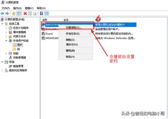 方法二:右键鼠标这台电脑→管理→本地用户和组→用户→找到你的电脑账户→右键鼠标设置密码→点继续→创建新密码→点确定即可完成。