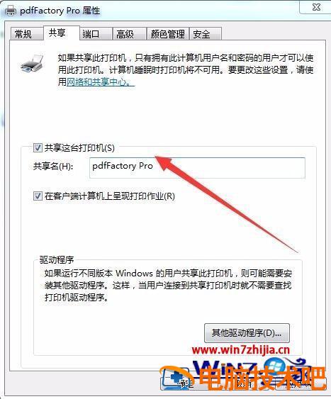 4、在弹出的界面里面,我们点击共享,而后别人就可以使用你的打印机了。