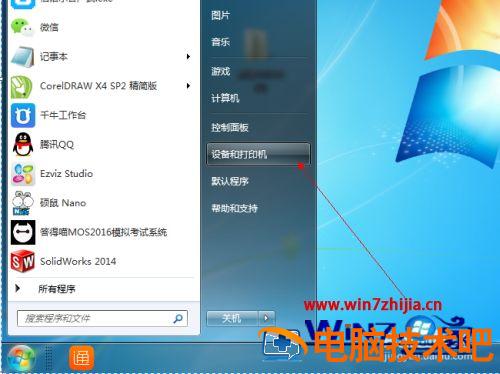 1、点击左下角菜单图标,而后找到设备和打印机点击进入。