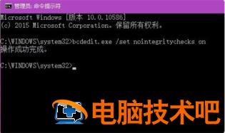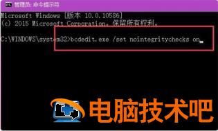 2、在打开的命令窗口页面中输入以下命令:bcdedit.exe /set nointegritychecks on,按回车键确认。