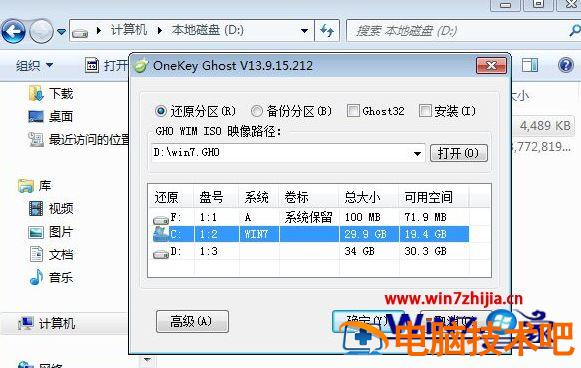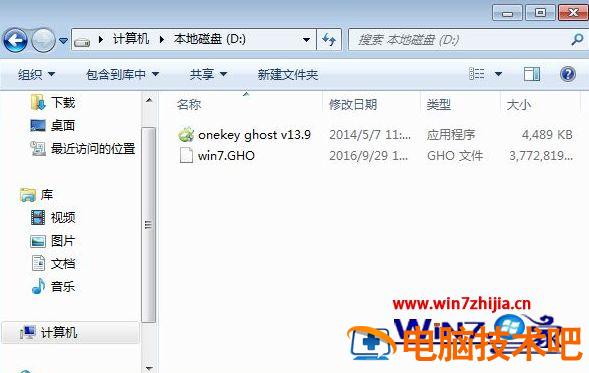 2、将win7.gho文件和Onekey ghost工具放到同一目录,比如D盘,不要放C盘或桌面;