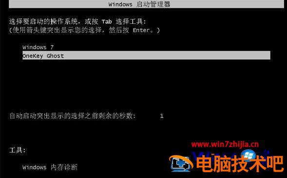 5、这时候电脑重启,开机启动项多出Onekey Ghost,默认自动选择Onekey Ghost进入安装过程;