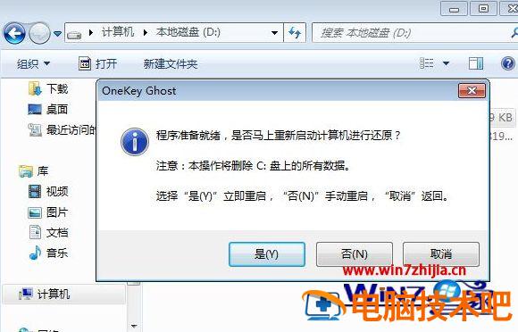 4、弹出提示框,确认没有重要数据之后,点击是,立即重启进行计算机还原;