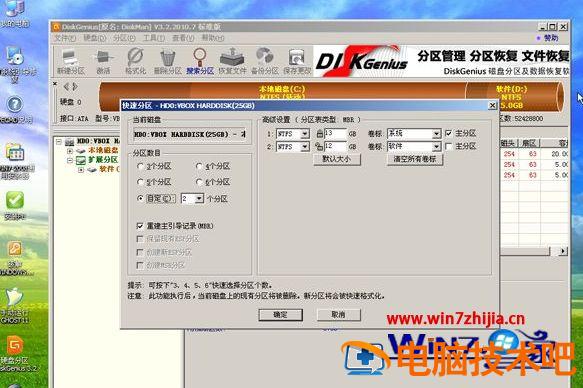 4、设置分区数目和大小,点击确定,执行分区过程;