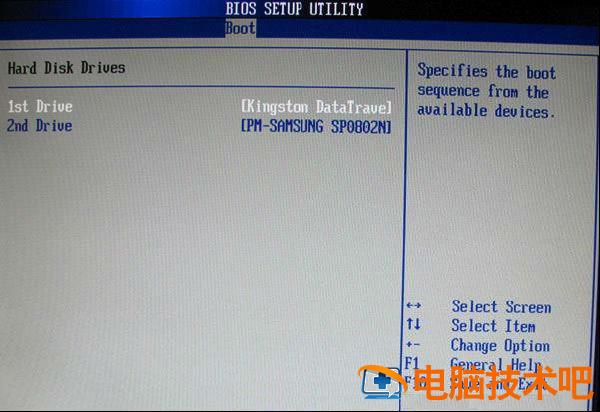 上图3-2 进入硬盘驱动器“Hard Disk Drives”界面,需要选择U盘作为第一启动设备“1st Drive”。如果之前在“Hard Disk Drives”里已经选择U盘为第一启动设备,如图3-2所示,那么在这个界面里就会显示有U盘,我们就可以选择U盘作为第一启动设备,如图4-2所示。