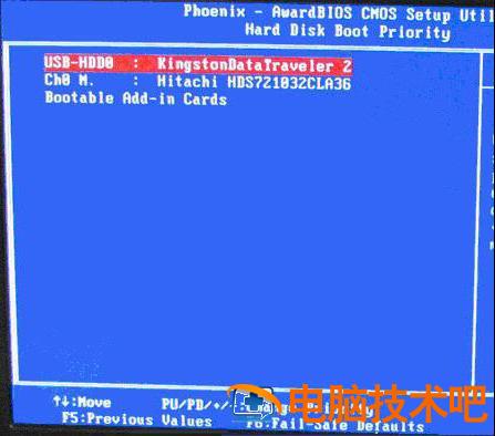 上图3-1:进入到硬盘启动优先级(Hard Disk Boot Priority)界面后。需要使用小键盘上的加减符号(+、-)来选择与移动设备,要将U盘选择在最上面。完成前面的步骤后按住ESC键退出,便会回到图2-1的设置界面。