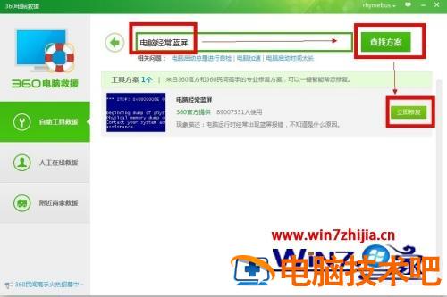 3、在电脑救援栏位上方输入“电脑经常蓝屏”后,点击“查找方案”,在下方会显示这个问题的解决方案,点击“立即修复”即可;