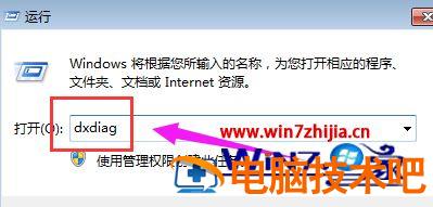 2、在运行输入框中输入dxdiag,确定,打开DirectX诊断工具;