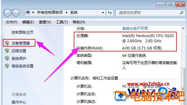 2、在系统属性可以查看“处理器”和“安装内存”两个信息,以及安装系统的版本和位数,如果要看显卡,则点击左上角“设备管理器”;