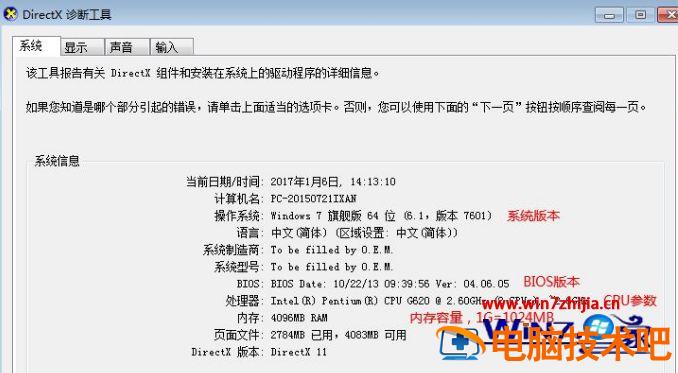 3、在“系统”选项卡中查看处理器参数、内存容量、BIOS版本和DirectX版本;