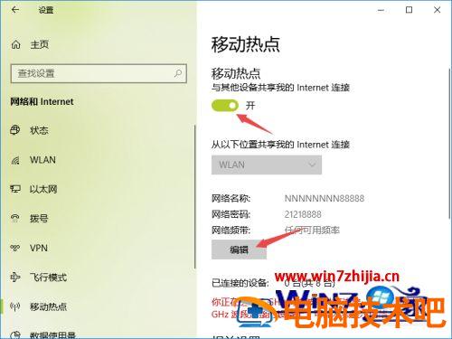 6、滑动完成后如图所示,这样也就开启了热点了。我们点击下方的编辑;