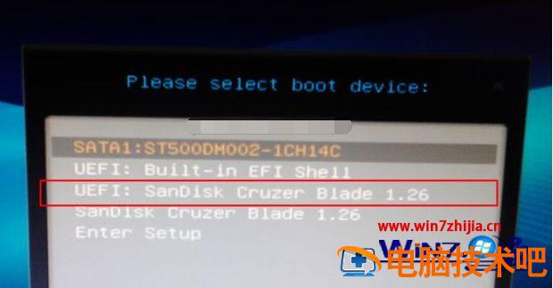 2、在需要重装系统的笔记本电脑上插入pe启动盘,重启后不停按F12或F11或Esc等启动快捷键。调出启动菜单对话框,选择识别到的U盘选项,一般是U盘名称或者带有USB字样的,比如SanDisk,如果要uefi模式下安装,选择带UEFI模式的项,按回车键进入;