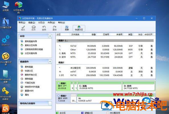 6、分区过程很快,分区完成后。如图所示,GPT分区会有两个没有盘符的ESP和MSR,这两个分区别去动,只需要看你分出的C、D盘等,如果盘符被占用,选择已经占用C盘的那个盘,左侧选择【更改盘符】,以此类推,不改也是可以的,可以根据卷标【系统】来判断系统盘的位置;