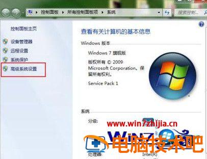 1、首先在win7系统中右键点击桌面计算机图标,选择属性,然后在弹出的窗口中,点击左侧的“高级系统设置”;