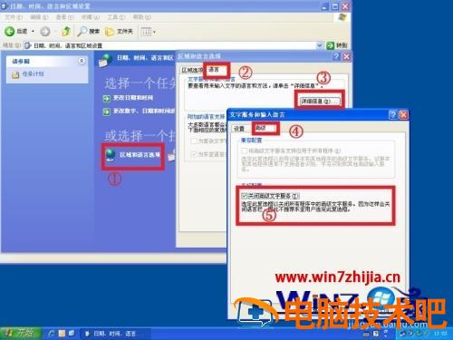 9、如果是win XP系统,参考1-3步骤,控制面板-区域和语言选项-语言-详细信息-高级将“关闭高级文字服务”复选框的勾去掉。