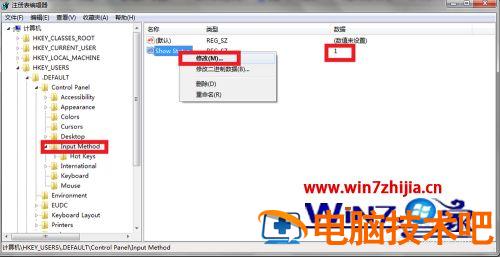 8、依次选择“HKEY_USERS\.DEFAULT\Control Panel\Input Method”,右边窗口中的 “Show Status”点击右键然后点“修改”。将数据数值栏修改为“1”(“0”为不显示输入法,“1”为显示输入法),注销系统或重启即可;