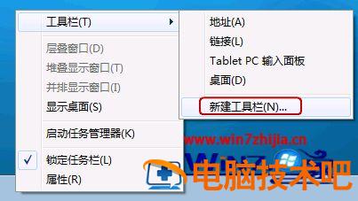 1、右击任务栏上,将鼠标放在工具栏上,然后选择新建工具栏。