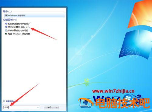2、然后在打开的菜单底部输入【内存】进行搜索,在上面就会显示【显示此计算机RAM大小】的提示,我们点击一下,就可以看到方法一的查询结果。