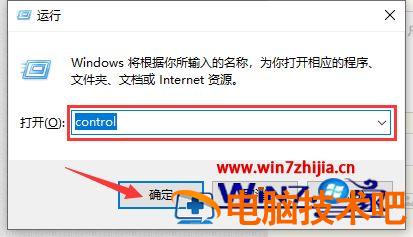 3、打开运行后,在运行搜索框输入“control”,点击下方的确定按钮,打开控制面板。