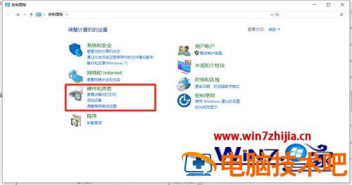 4、在“控制面板”中,选择“硬件和声音”设置项。