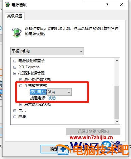 8、在“电源选项”的对话框中,设置“系统散热方式”的“使用电池/接通电源”为被动即可。
