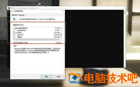 5、计算完成之后,弹出“(C:)的磁盘清理”对话框。在对话框中,在需要删除的垃圾文件前的方框内打上对勾。这里选择“回收站”、“缩略图”以及“临时文件”,点击“确定”。