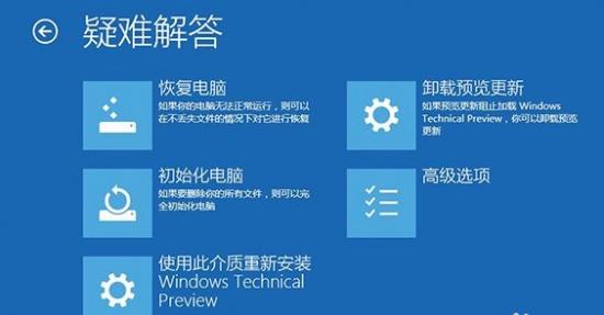 第四:使用win10RE更新卸载使系统崩溃。进入win10RE,然后选择疑难答案。
