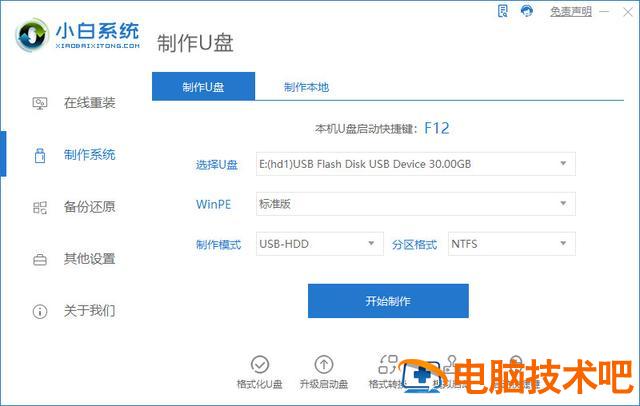 1.我们下载一个小白一键重新安装系统软件,将我们的空白u盘插入计算机,然后选择在页面制作。
