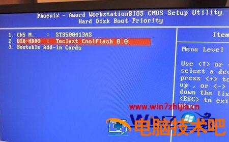 4、选择USB-HDD按加减号、F5/F6或PageUP/PageDown,移动到第一位置,按F10回车重启;