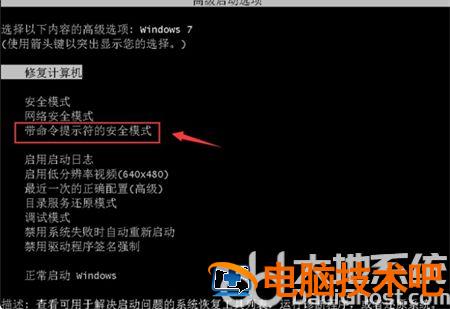 1、重启电脑,然后不停按F8,直到电脑出现高级启动选项的界面,选择“带命令提示符的安全模式”后进入