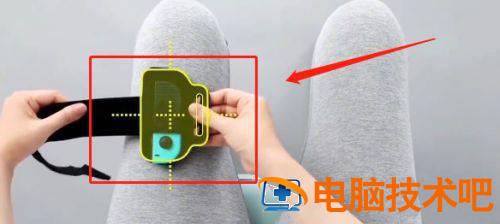 3、坐在椅子上将腿部固定带对准大腿的中心点,不要偏离中心点,用腿带缠绕大腿将腿带拉到右侧把前端黏住固定,腿部固定带穿戴完成。如果腿带太松请重新绑紧。并确认是否穿戴于大腿正中央。
