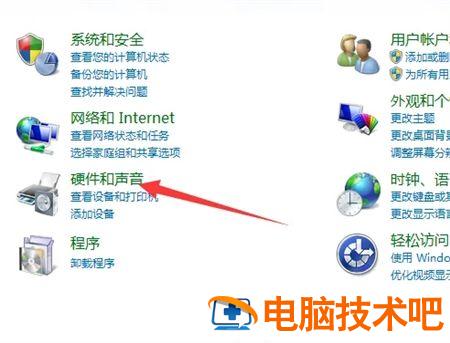 一、打开系统控制面板,找到硬件和声音,点击打开。