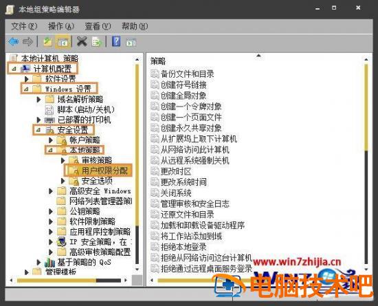 2、这时候我们会打开一个本地组策略编辑器,然后按照“计算机配置—Windows设置—安全设置—本地策略—-用户权限分配”;