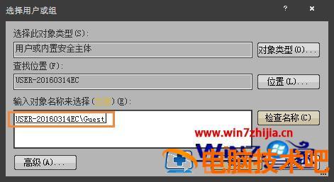 4、紧接着我们再去单击“添加用户或组”的按钮,输入“guest”后点一下“检查名称”,然后再点击一下确定;
