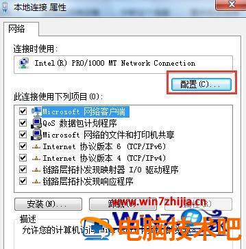 5、打开本地链接属性对话框后,点击上方的“配置”并在网卡属性框内点击上方的“高级”选项,在下方的属性内找到“流控制”并设置成“已禁用”即可