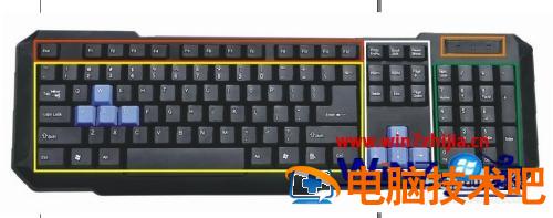 1、先把键盘分成不同的区域,然后每个区域再单独解答。如下图,分成5个区域,红,黄,白,绿,橙。【橙色部分是指示灯。】