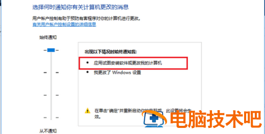 4、在用户账户控制设置界面中,可以看到“应用试图安装软件或更改我的计算机”这项为“始终通知”,这就是造成每次打开软件都弹出提示窗口的原因。