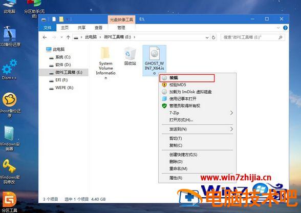 6、完成分区之后,打开此电脑—微pe工具箱,右键win7系统iso镜像,选择【装载】,如果没有装载,则右键—打开方式—资源管理器打开;