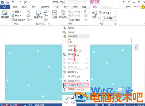3、这时候就会发现图片加到文档中,这时候就鼠标右击图片,然后在弹出来的菜单中选择“大小和位置”选项;