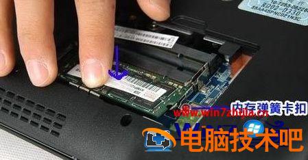 4、如果你的内存插槽仅有一个,那么升级内存就需要使用替换法,将老内存替换掉,这就需要先将原有内存拆除。而方法很简单,内存两侧会有两个弹簧卡扣,用左右手的手指尖将卡扣搬开,内存就会自动弹出,然后取下即可。