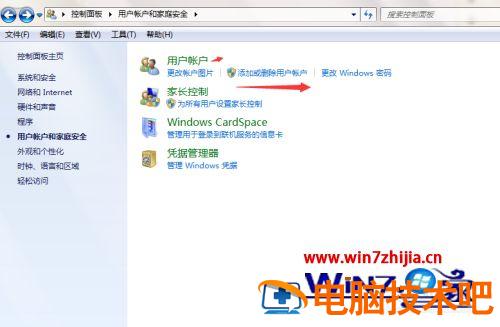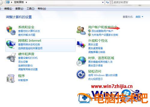 2.在控制面板主页点击用户账户和家庭安全功能。