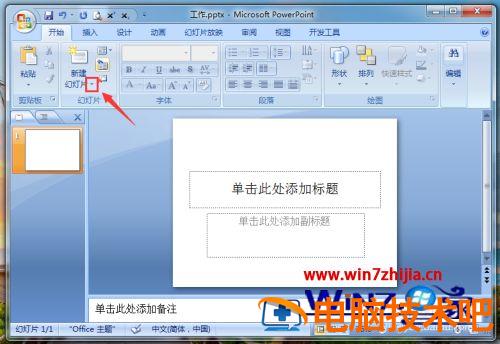 1、电脑打开PPT幻灯片,进入页面,点击“新建幻灯片”下方的三角形。