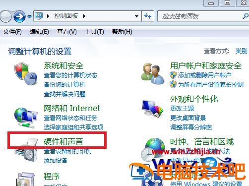 3、进入控制面板后,在选项中选择“硬件和声音”,点击进入。
