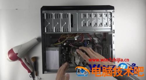 3、然后用电吹风将灰尘吹走,深层清理建议找专业人员,接着将风扇安装回去,装上机箱后盖,拧上螺丝即可。