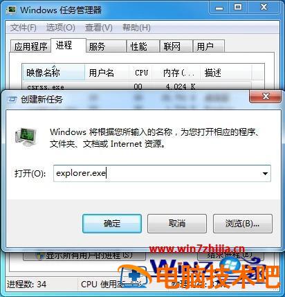 3、然后在创建新任务的对话框里输入“explorer.exe”后就可以重新启动windows资源管理器;