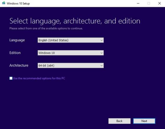 如果不是为本机升级,媒体创建工具会提示你选择对应的语言、版本、以及 PC 架构(32 位 x86、或 64 位 x64)。